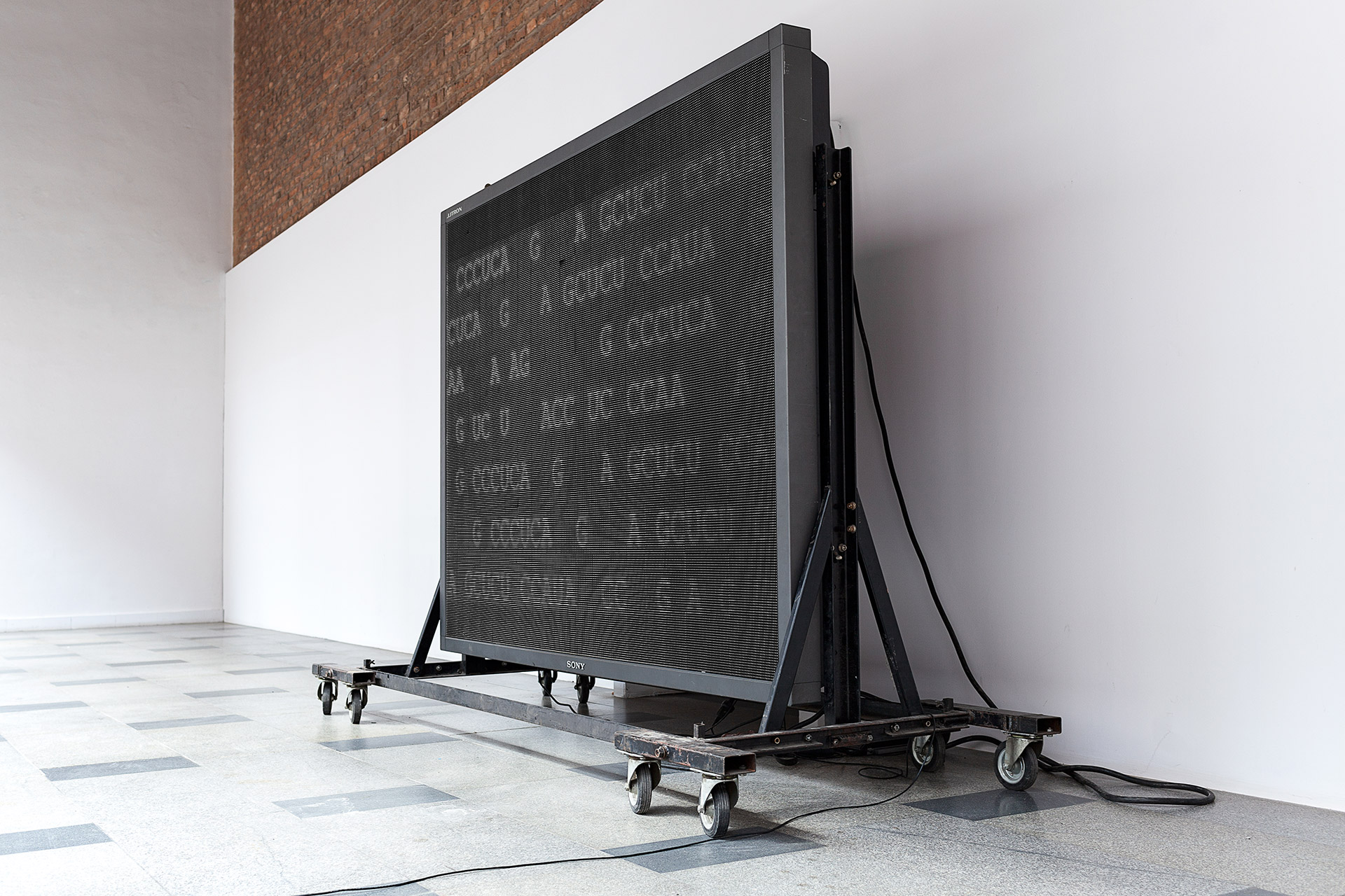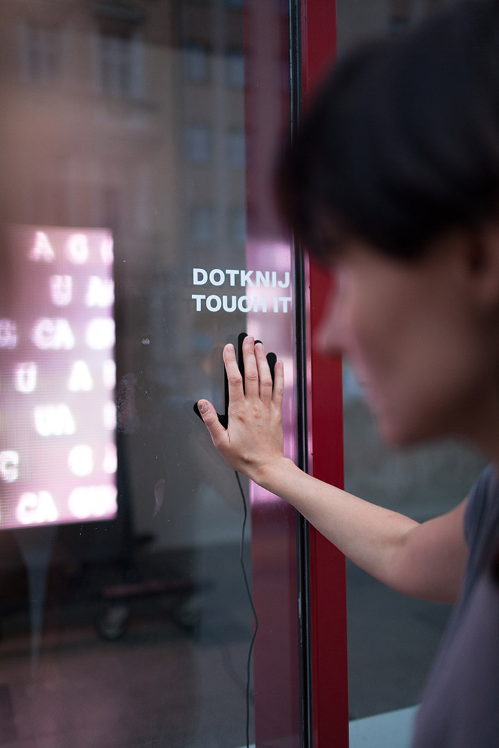 In the Awangarda gallery bwa Wrocław the work is shown as an installation in a window on a led screen (300 × 200 cm), recast as a DNA sequence. The untampered image is accessible to the passers-by through a touch sensor placed outside of the window. Changing the picture on the screen we become the authors of one the versions. The “weaker” the life is in reality, the more we try to create an abstract picture, an illusion devoid of meaning through an empty, aesthetic gesture.