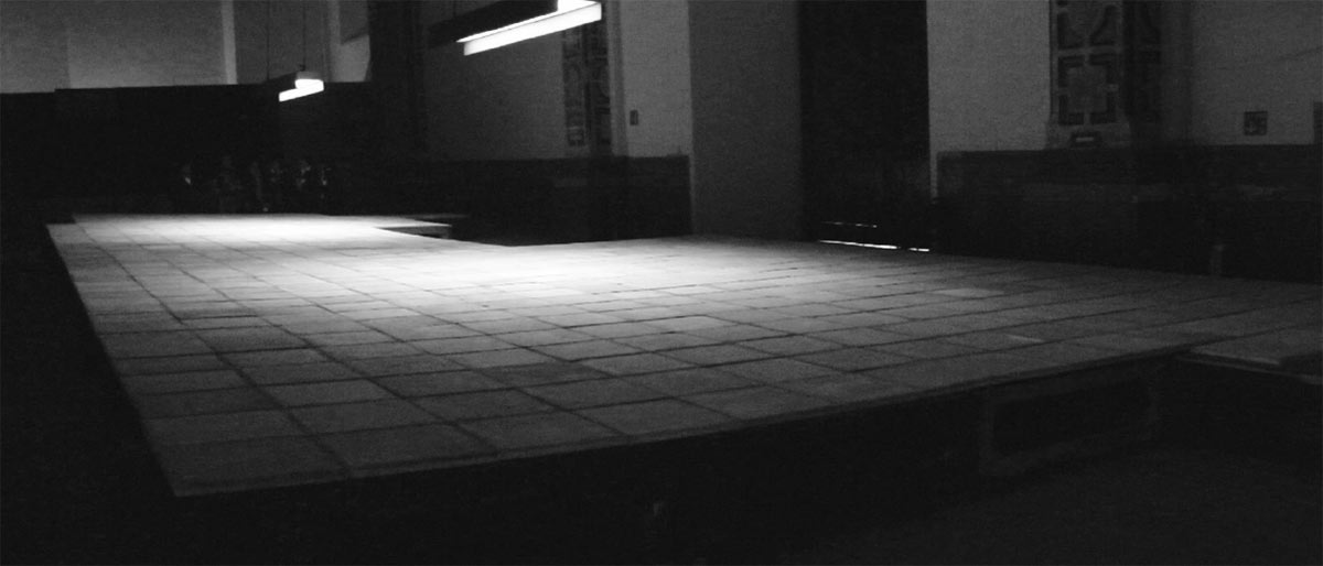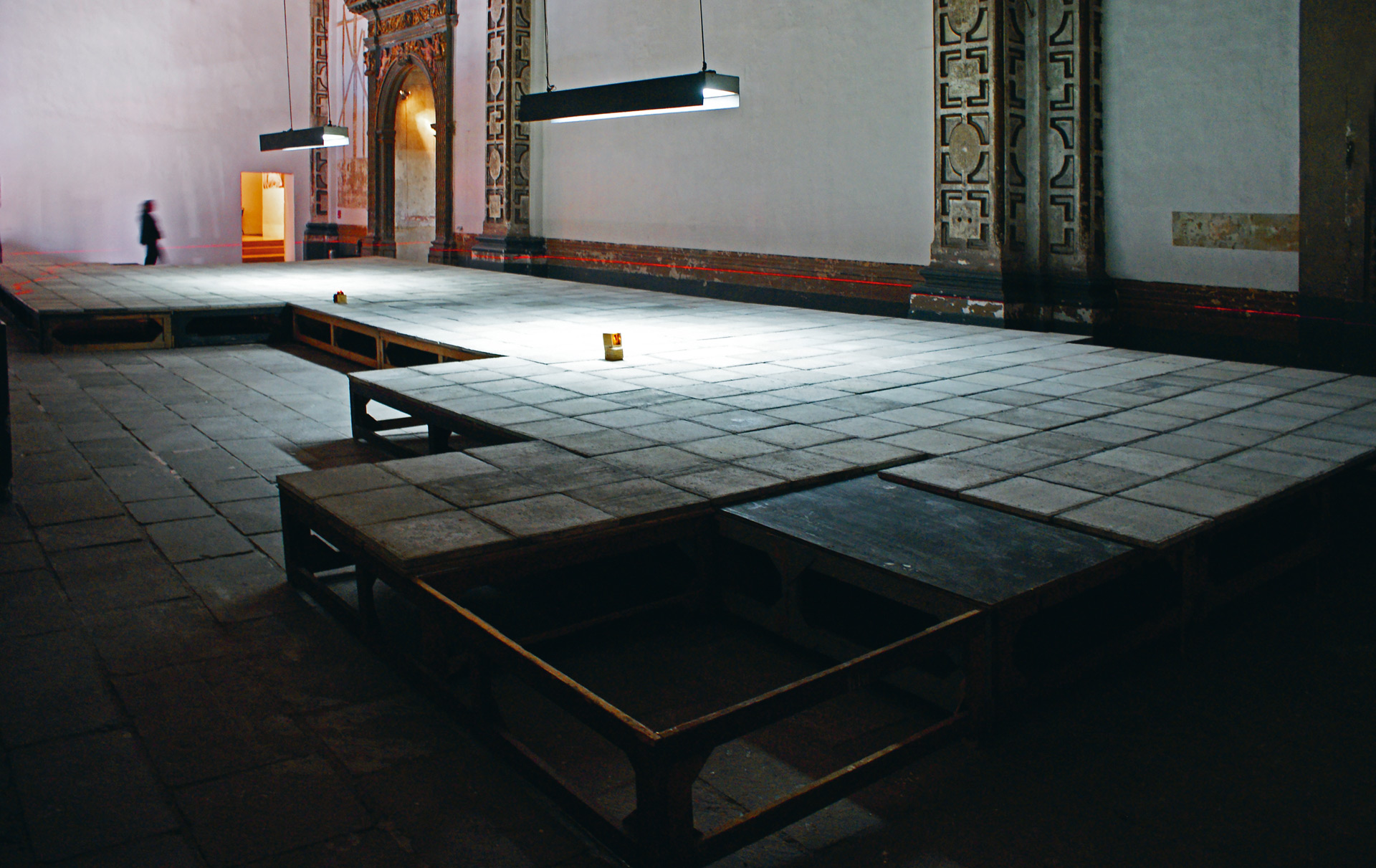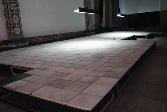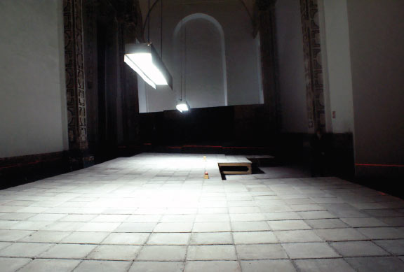 he idea for the Nave Principial project was to uncover the stone tiles and to excavate a 7×25 m (ca. 23 x 82’) rectangular opening in the slanted floor, exposing the underlying surface, parallel to the existing floor level.